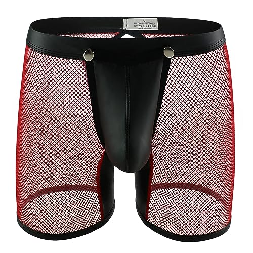 Evankin Men's See Through Sexy Mesh With Faux Leather Loose Shorts Pants Erotic Clubwear Button Removable Pouch, Leather Red, Large