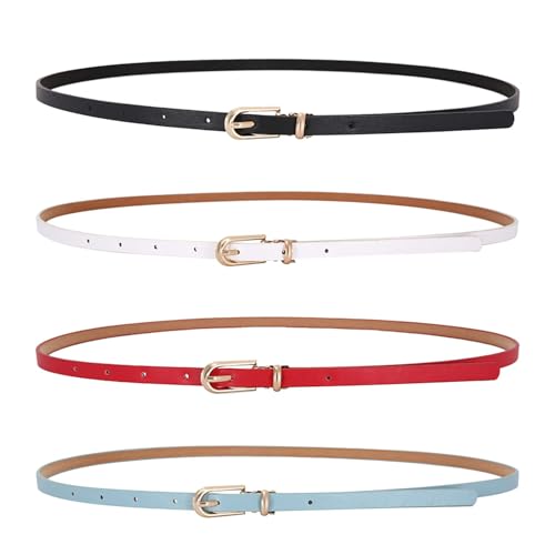 LECTNORE 4Pcs Women Skinny Leather Belt for Dresses Thin Waist Belt with Metal Buckle for Jeans Dress Pants(black/white/red/blue)…
