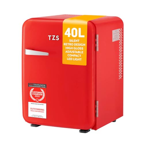 TZS First Austria - Retro Mini Fridge 40L Silent - Small mini fridge in vintage design with interior lighting & 2 door compartments - Minibar for camping, office, bedroom & hotel - red