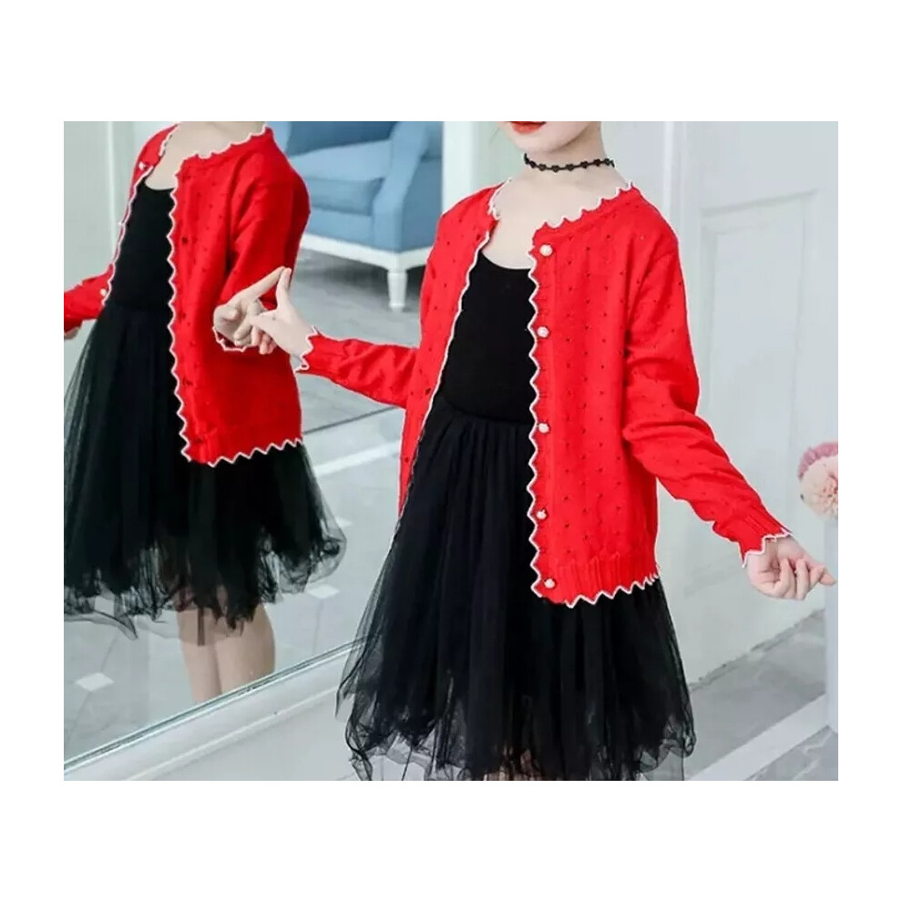 (Red, 4-5 Years) Girls Cardigan Long Sleeve Sweater Knitted School Jumpers Spring Age 3-12 Years