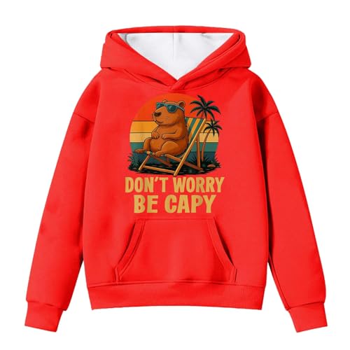 Girls Hoodie Kids Long Sleeve School Hooded Jumper Teen Girls Round Neck Cartoon Capybara Print Hoodies Sweatshirt Loose Fit Pullover Top with Pockets Outfit Clothes Age 4-14 (Red, 12-13 Years)