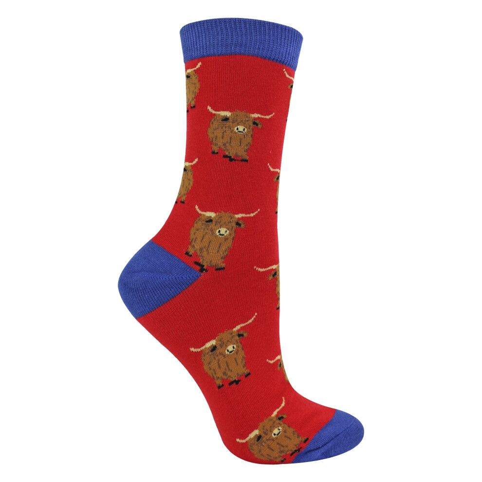 (04-Aug, Red) Miss Sparrow - Ladies Highland Cow Socks | Womens Novelty Bamboo Gift Socks For Cow Lovers