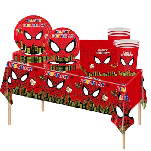 69Pcs Kids Spider Birthday Party Tableware Set,Red Plastic Spider Table Cloth,Paper Plates Napkins Serviettes and Cups Dinnerware Set for Kids Boys Birthday Supe-rhero Spider Party Decorations