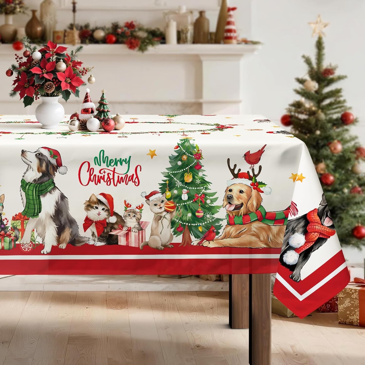 Christmas Cats Dogs Tablecloth Waterproof, Red Table Cloth Rectangle, Washable