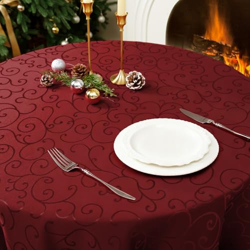 Romanstile extra large Red Christmas Table Cloth Round 250 cm,Water-Repellent & Wipe Clean,Vintage Floral Jacquard,Xmas Tablecloth for Holiday Meals,Christmas Dinner,New Year Celebration,Gift idea