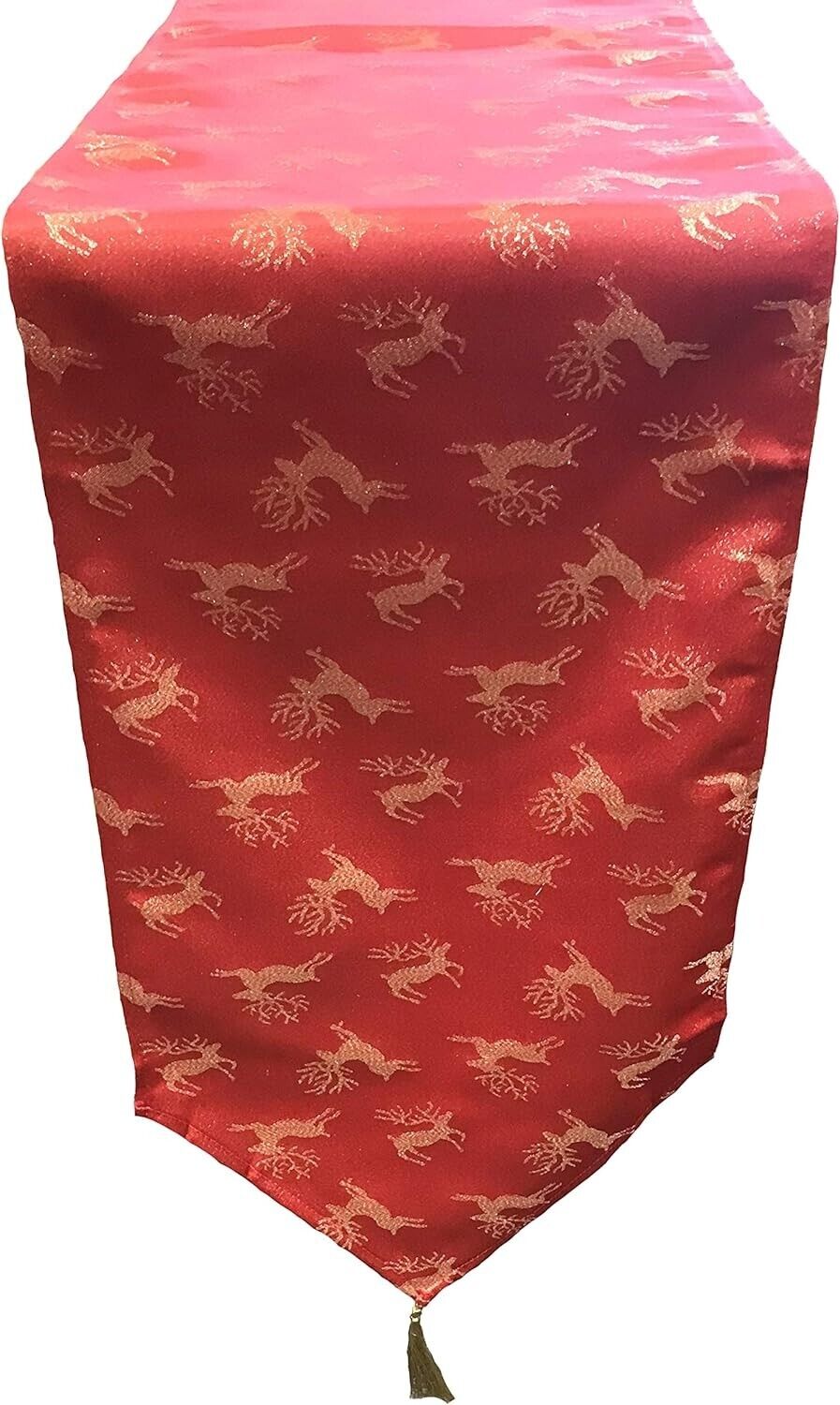 Deer Red Gold Table Runner 13" x 72" Party Time Stylish Tassel End Luxury
