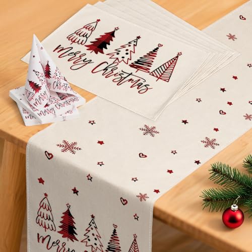 YCOLL Christmas Table Decorations – Red Winter Table Runner, Modern & Water-Resistant, with Placemats and Napkins Set for Indoor & Outdoor Use, Party, Kitchen & Dining Table Décor