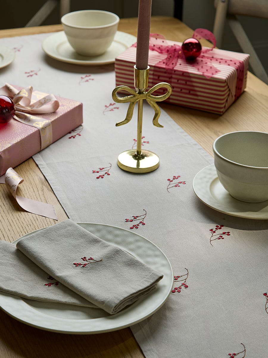 Cotton Embroidered Red Berry Table Runner