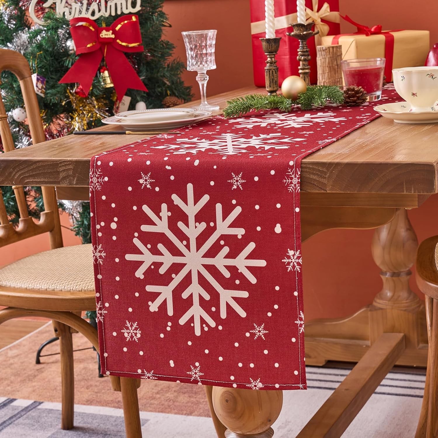 Red Snowflake Table Runner Linen Christmas 13x72 Inch Festive Dining Table Clot