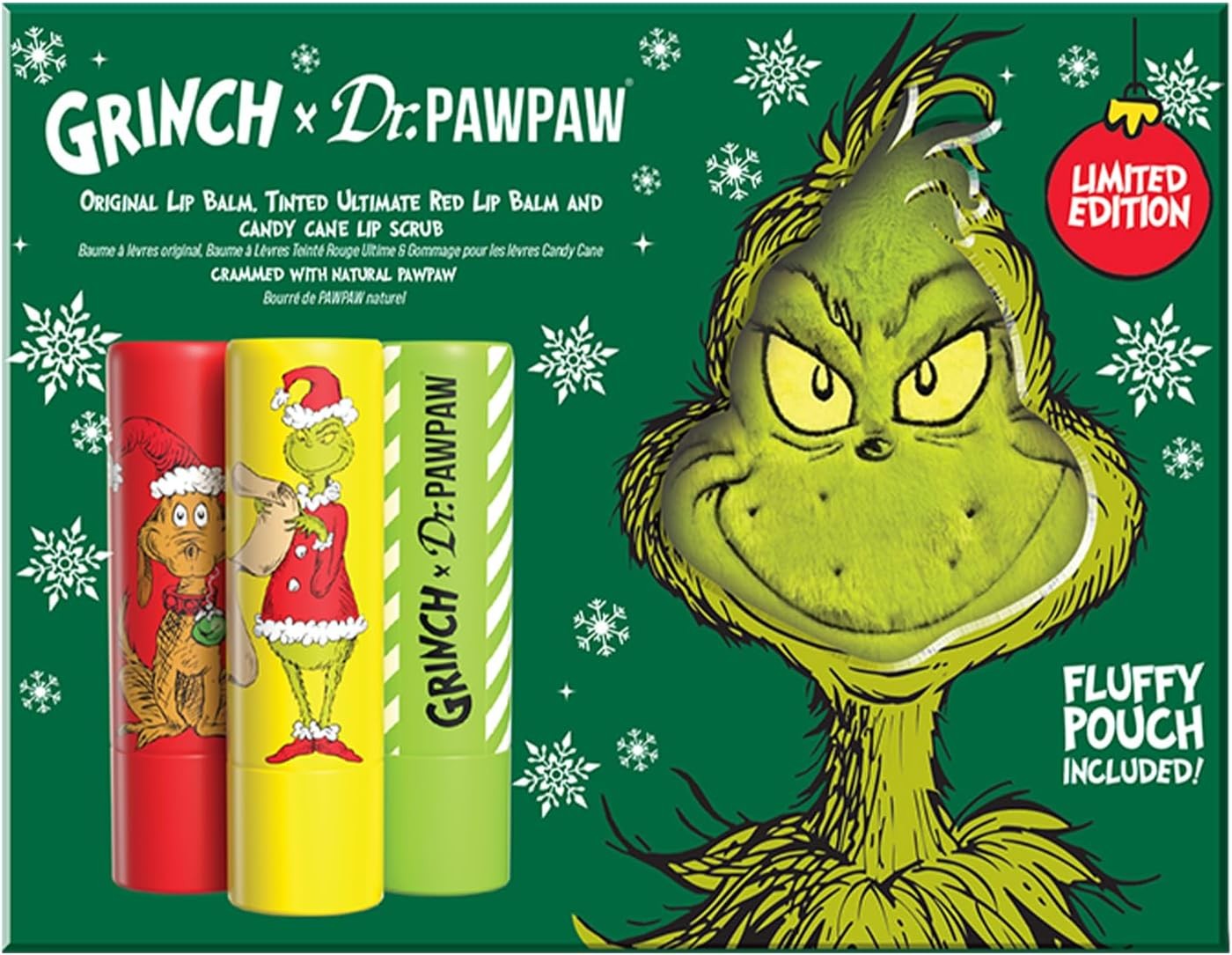 Dr.PAWPAW x The Grinch Original, Peach Pink & Ultimate Red Gift Set (3 x 4g) + Pouch, Hydrating & Tinted Lip Balm Trio, Nourishing PAWPAW-Infused
