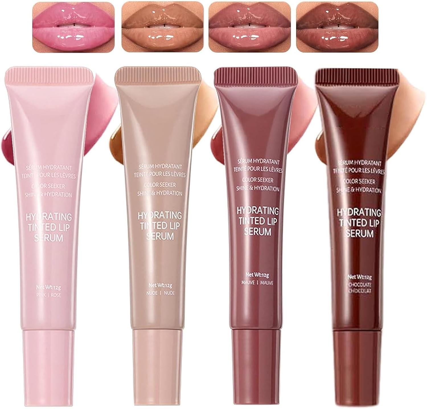 4Pcs Tinted Lip Balm Serum Set,Hydrating Plumping Pink Nude Red Glossy Lip Glos