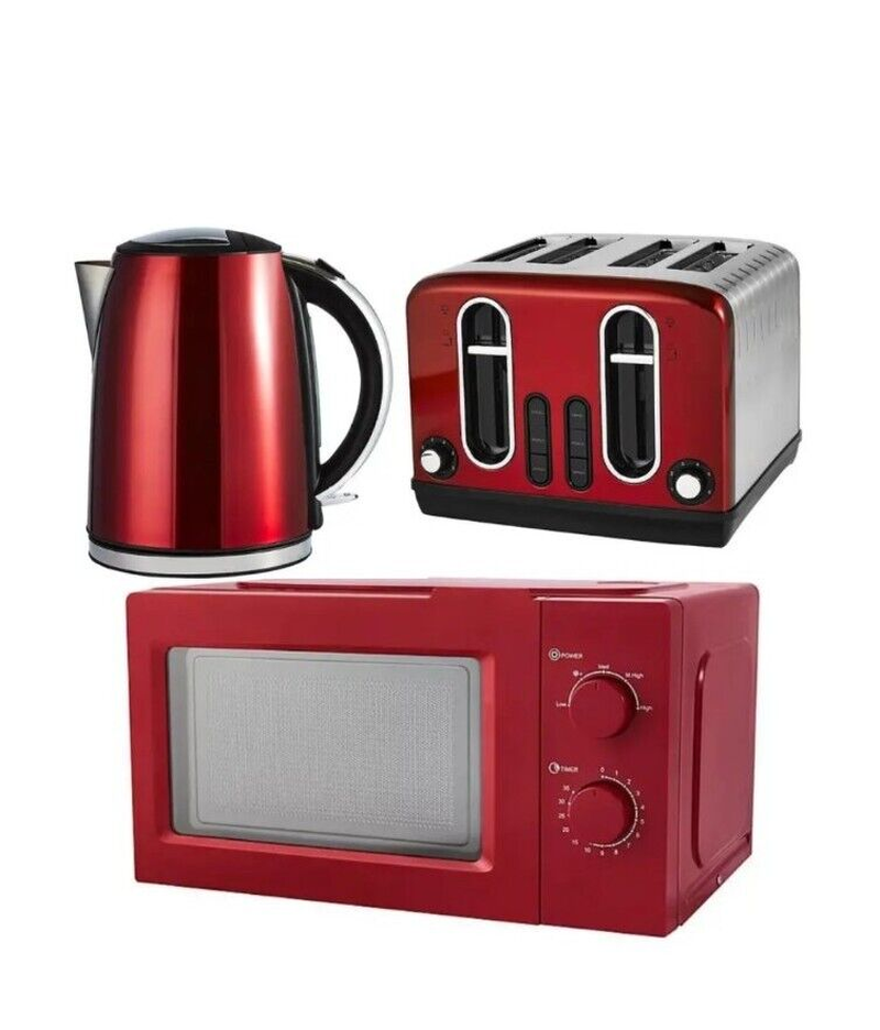 Red 3KW Rapid Boil Kettle, 4-Slot Toaster & 700W 17L Microwave Kitchen Set UK
