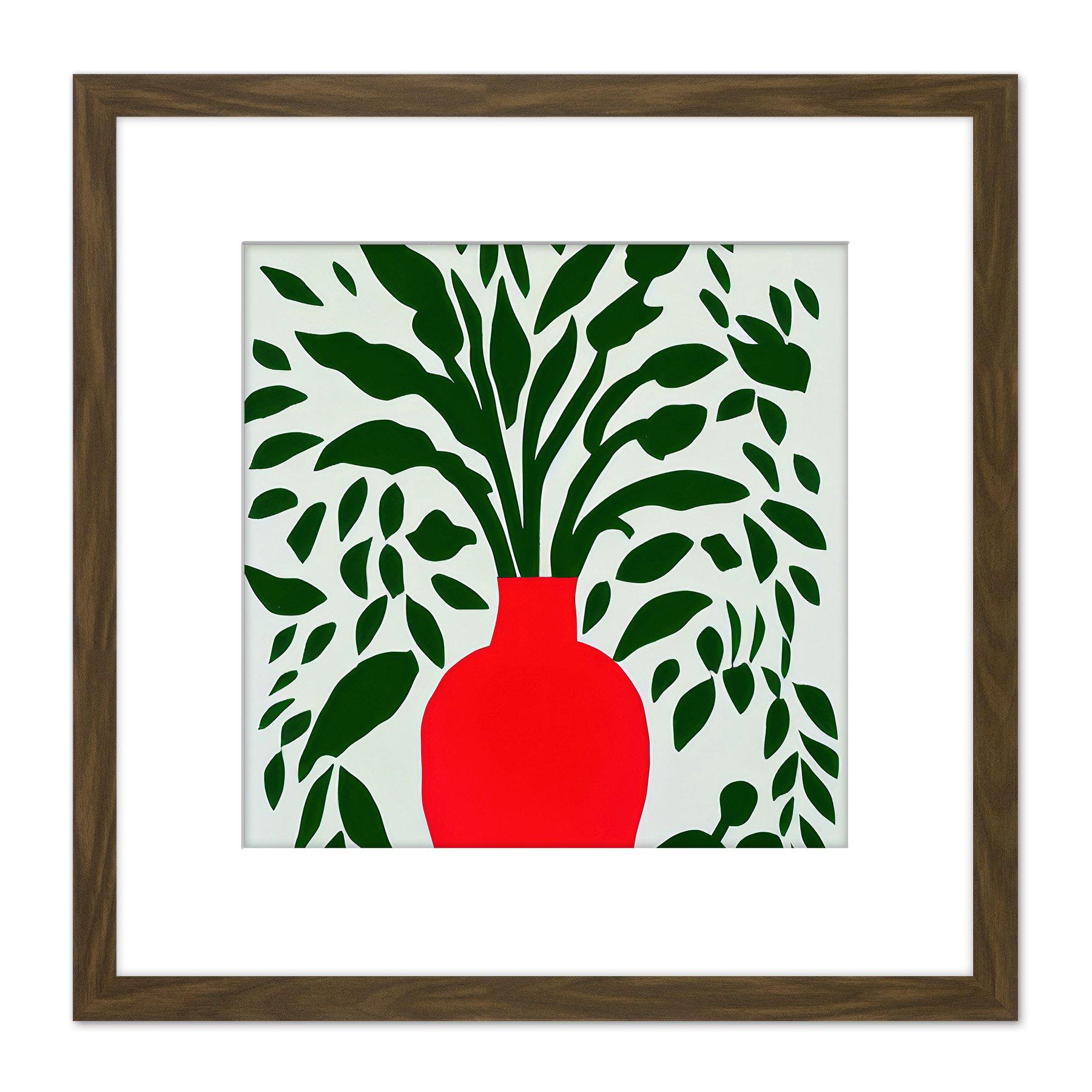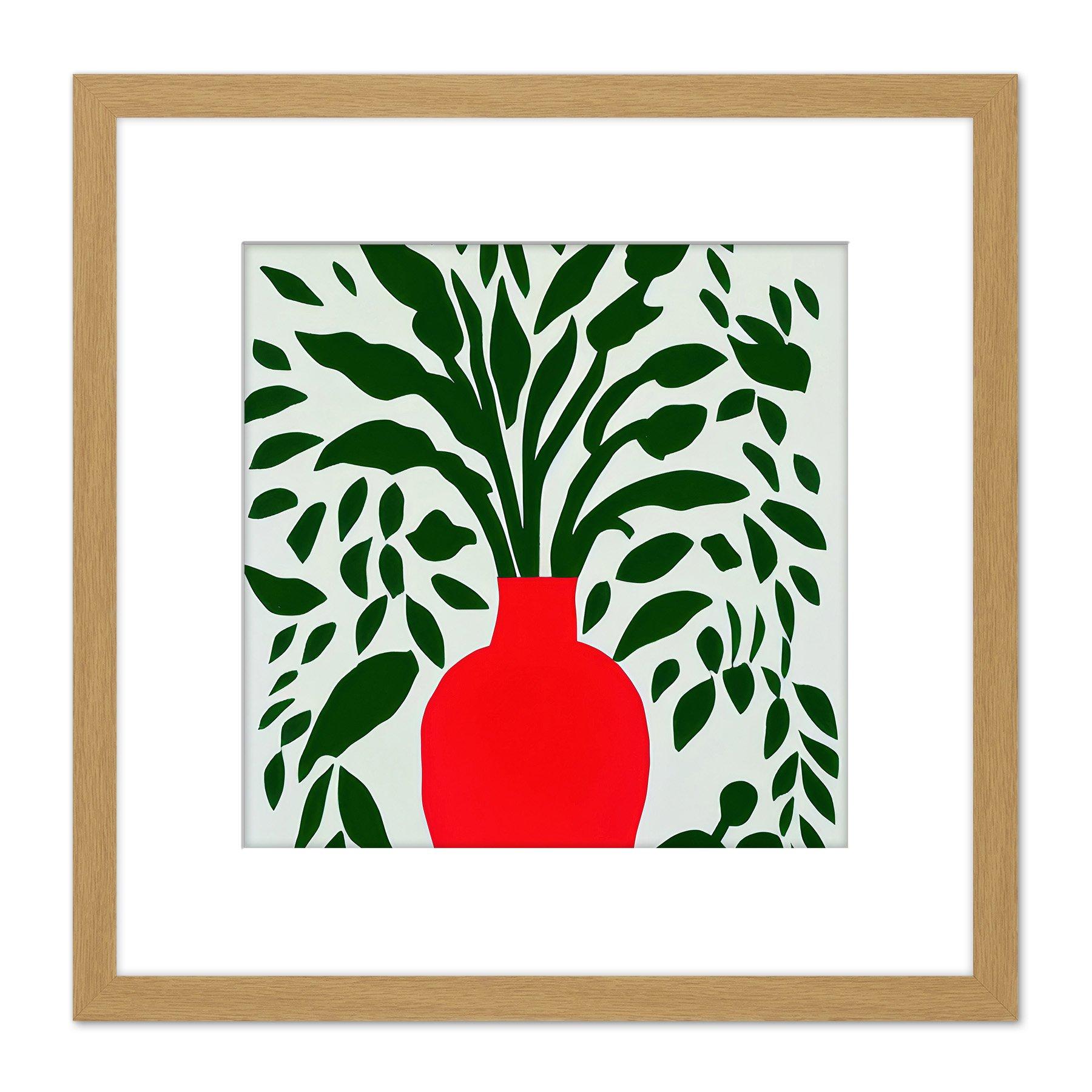 Abstract Green Leaves Bold Red Vase 2D Illustration Square Wooden Framed Wall Art Print Picture 8X8 Inch