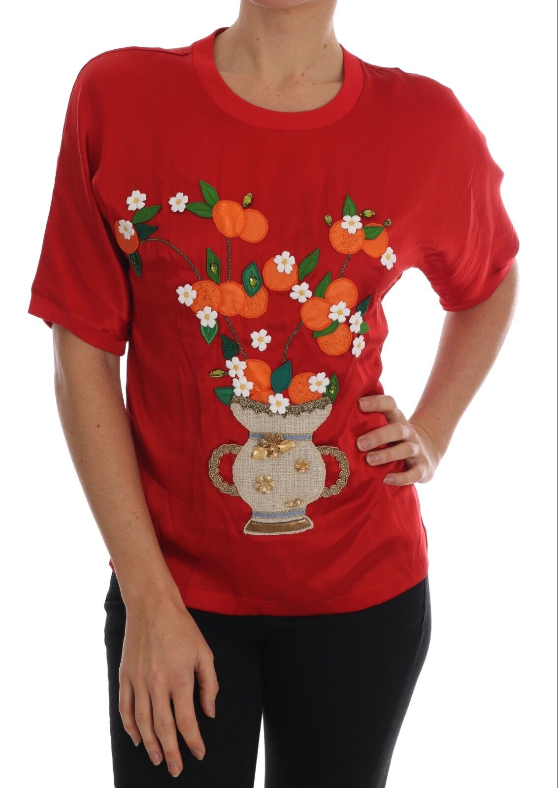 DOLCE & GABBANA Blouse Red Silk Orange Vase Crystal Top IT36/ US2 / XS