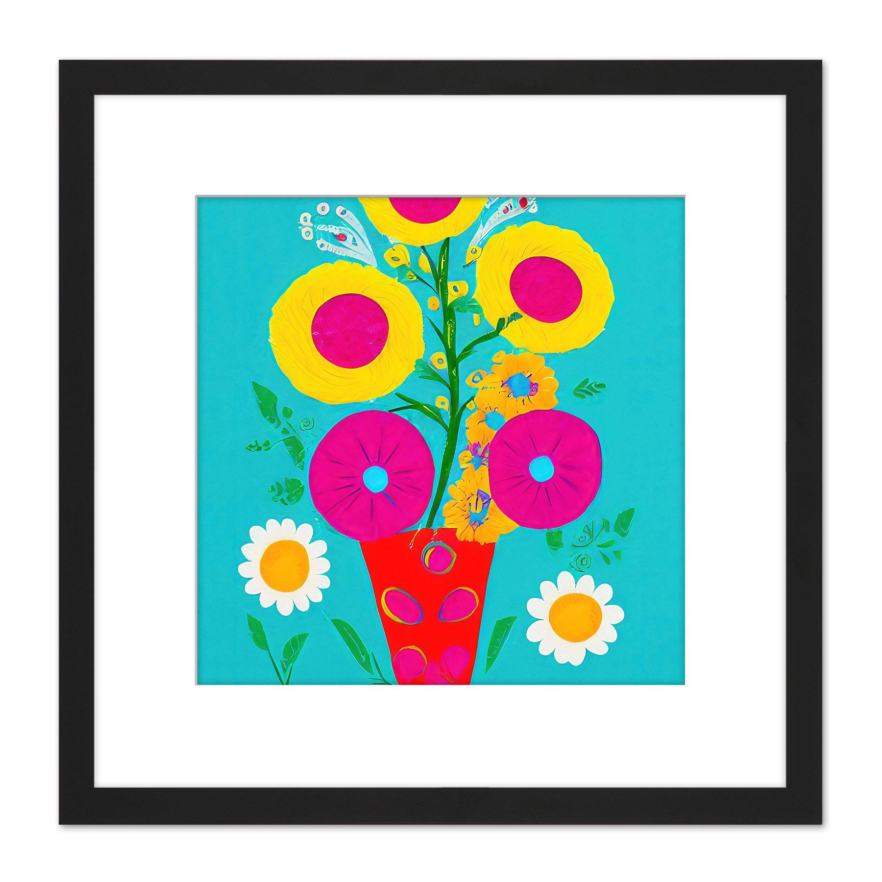 Bold Bouquet Pink And Yellow Flowers Red Vase On Arctic Blue Square Wooden Framed Wall Art Print Picture 8X8 Inch