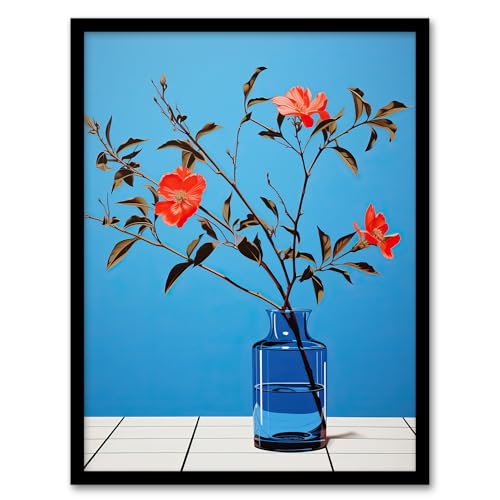 Wee Blue Coo Elegant Simplicity Red Flowers Blue Vase Artwork Framed Wall Art Print A4