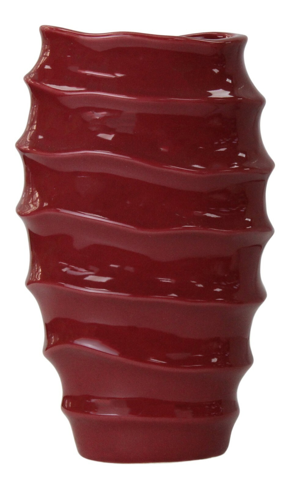Red Ceramic Vase Oval Decorative Table Flower Vase Ornament Rippled Design 23cm