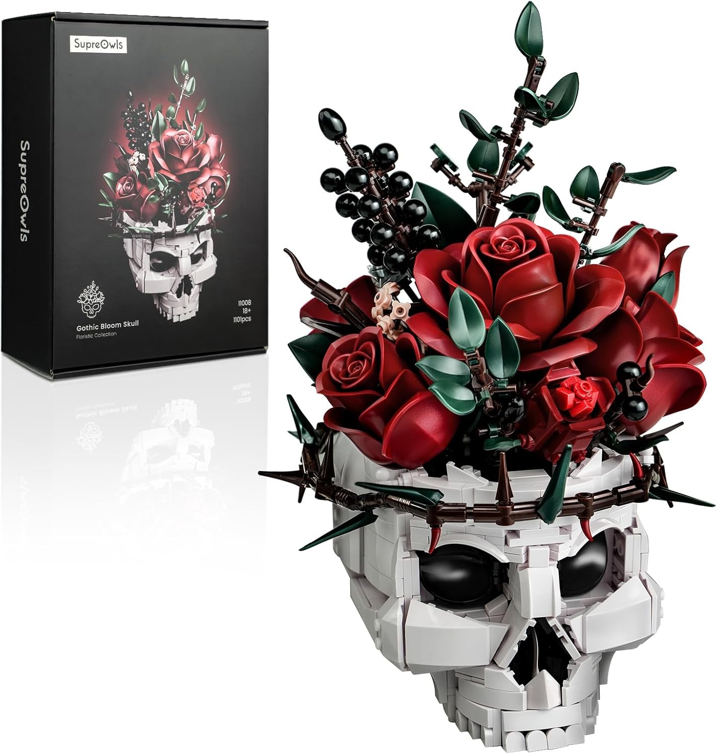 Millionspring Red Rose Bouquet Building Set with Skull Vase Red Artificial Roses Gifts for Her Him on Birthday, Anniversary, Valentine's Day, Halloween, Christmas,Gothic Home Decor