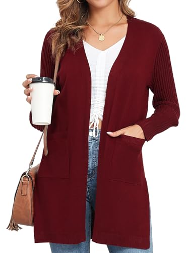 Wiwclo Womens Lightweight Long Sleeve Open Front Sweater Cardigan Dressy with Pockets, Wine Red, X-Large