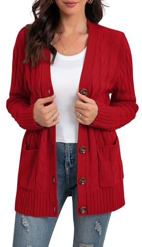 Easygou Womens Button Cardigan Sweater Coat Cable Chunky Knit Oversized Sweater Soft Long Sleeve Open Front Slouchy Pocket Outwear Coat (Red,M)