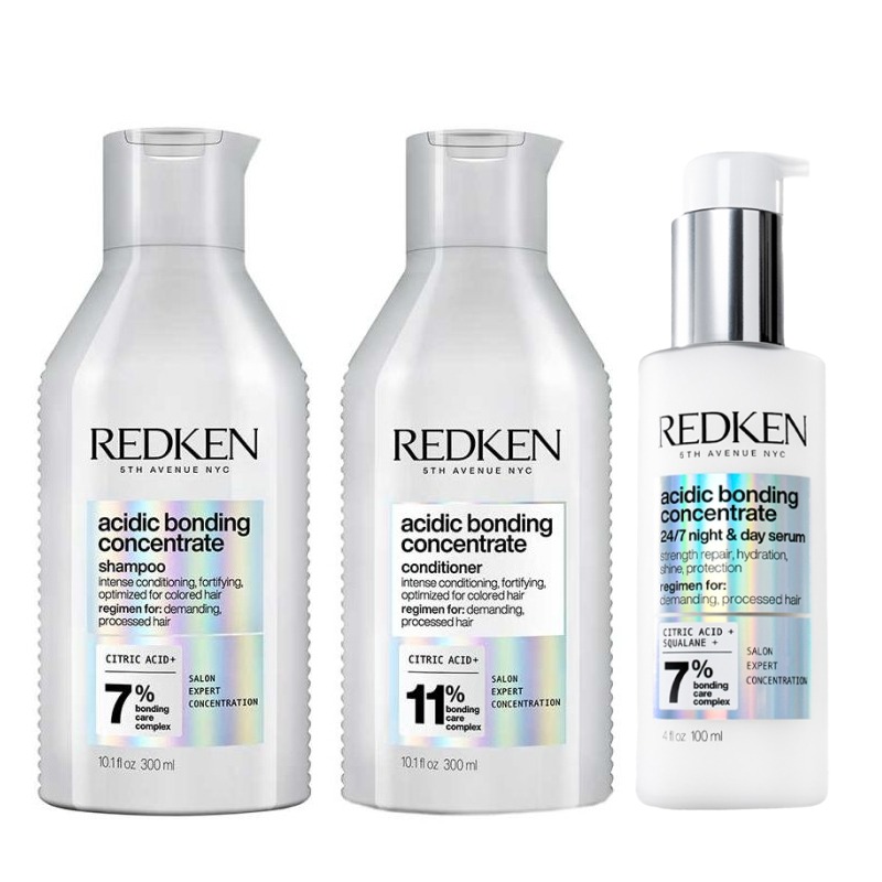 Redken Womens Acidic Bonding Concentrate Set – Shampoo 300ml, Conditioner & 24/7 Night & Day Serum 100ml - One Size