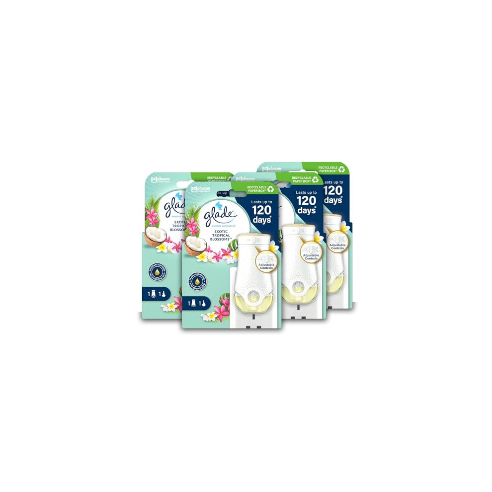 Glade Plug in Air Freshener Holder and Refill, Electric Scented Oil Room Air Freshener, Tropical Blossoms, Pack of 4 Starter Kits, (4 x Holder and 4 x