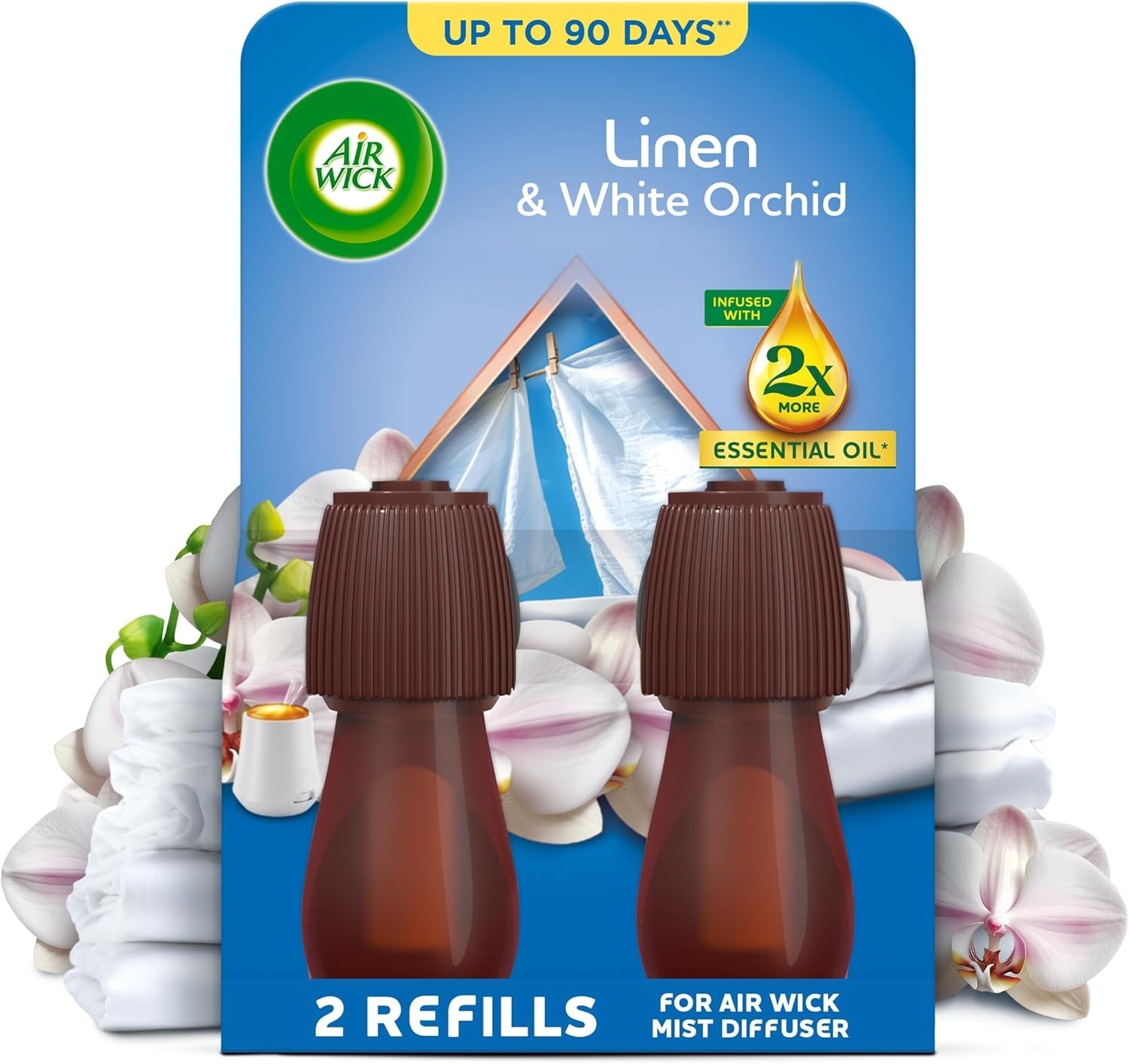 Air Wick Essential Mist Twin Refills, Linen & White Orchid, Pack 2 x 20ml, Natural Essential Oils, Last up to 90 days, Air freshener