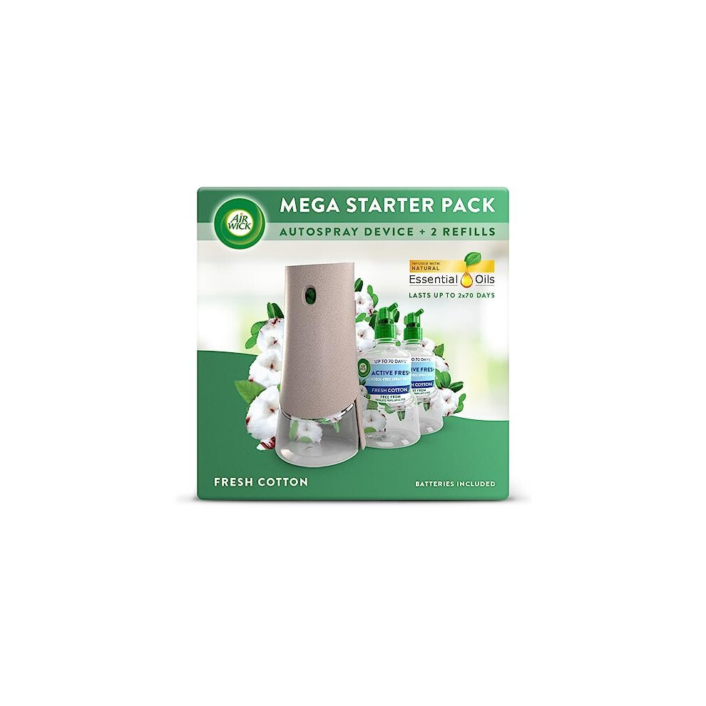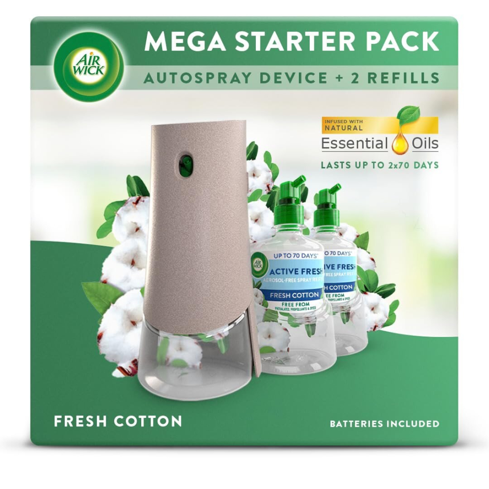 Air Wick Aerosol-Free Automatic Air Freshener Spray Starter Kit, Fresh Cotton, 1 gadget, 2 Refills & 2 AA Batteries, 24x7 Active Fresh Odour
