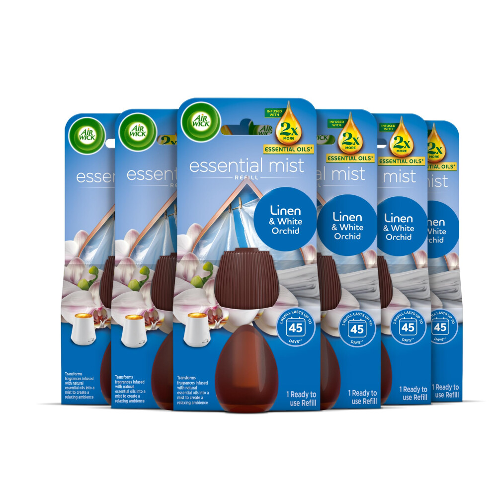 Air Wick Essential Mist Refills, Linen & White Orchid, Pack 6 x 20ml, Natural Essential Oils, Last up to 270 days, Air freshener