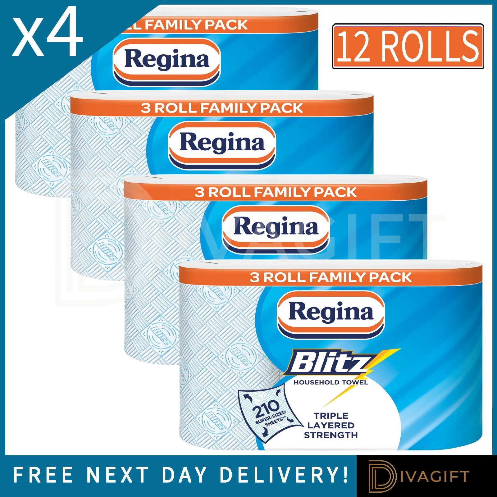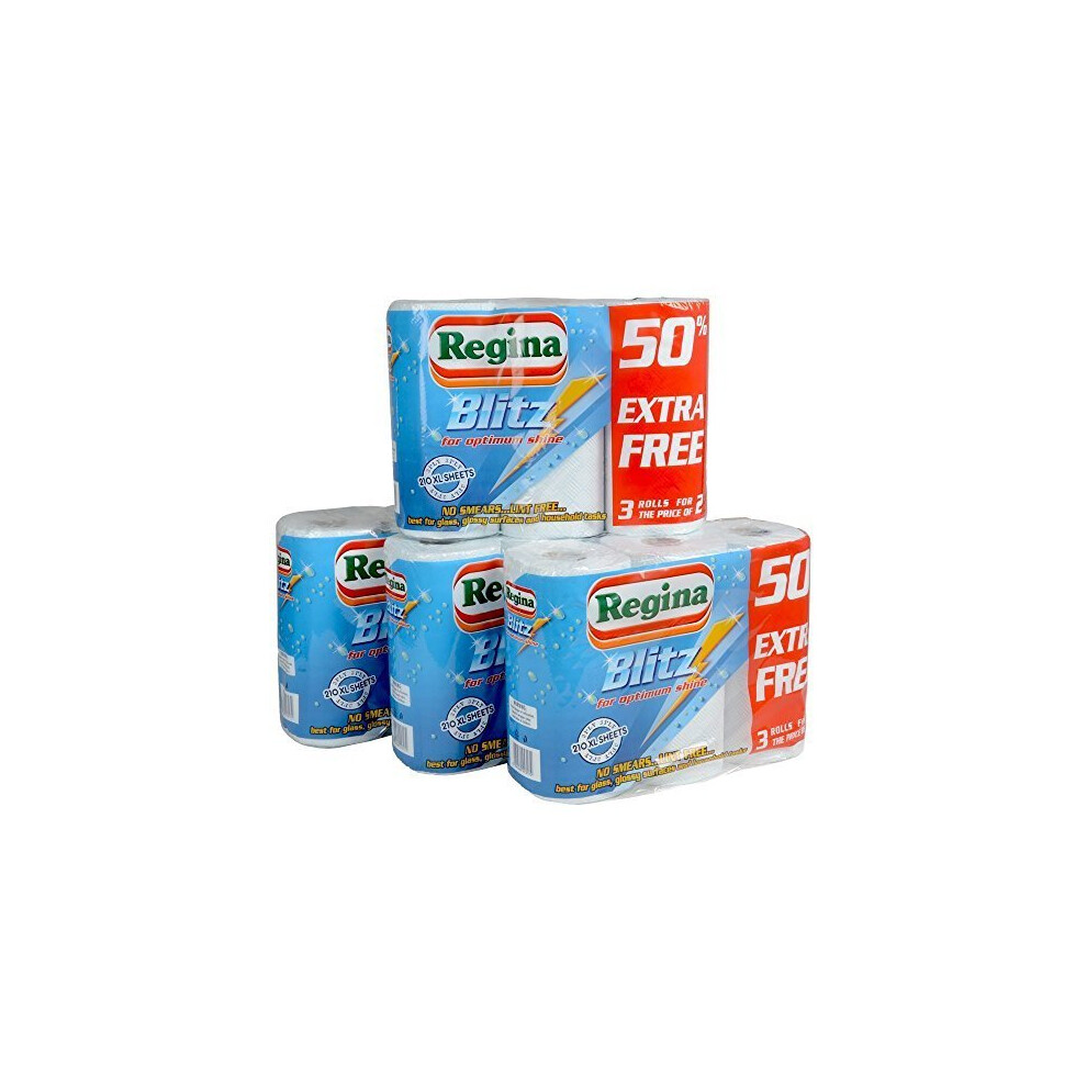 12 ROLLS REGINA BLITZ 3PLY KITCHEN ROLL FAMILY 4-PACK PAPER TOWELS 210 SHEETS