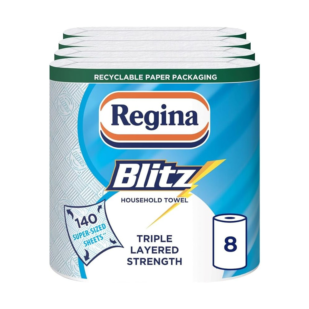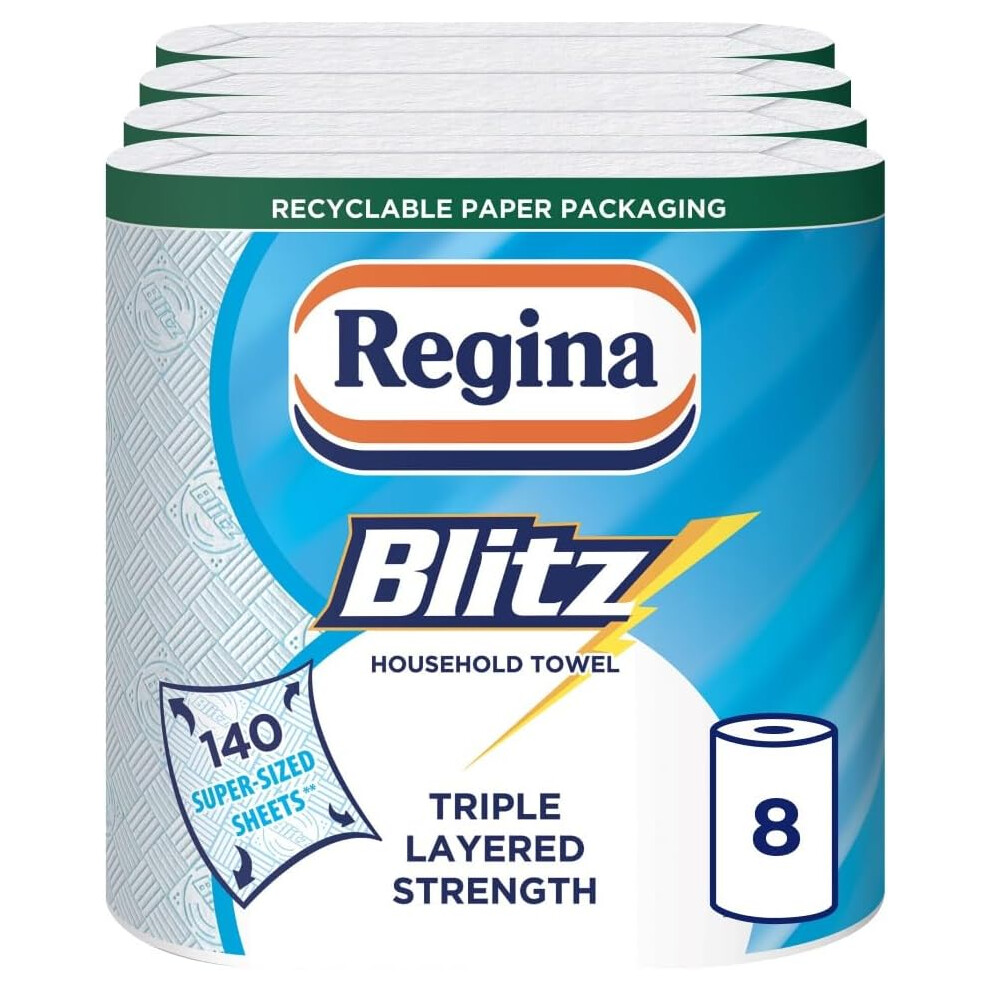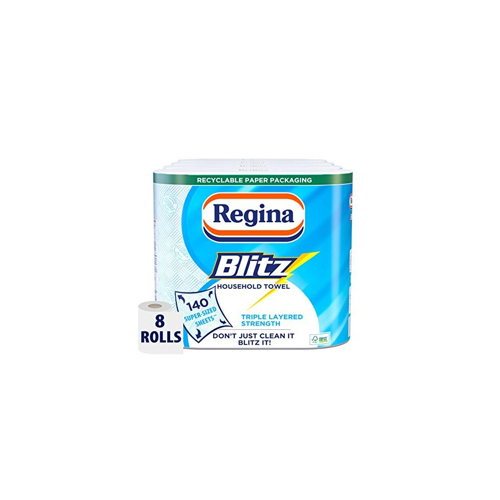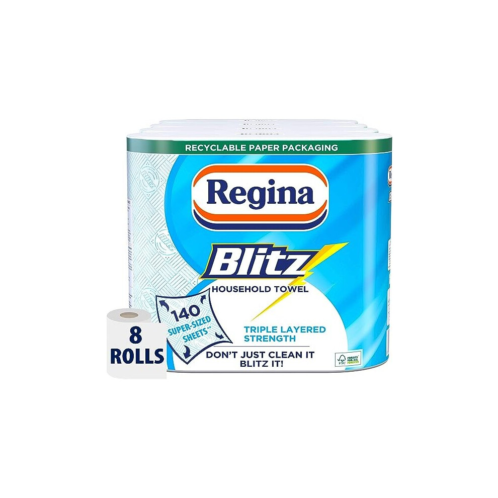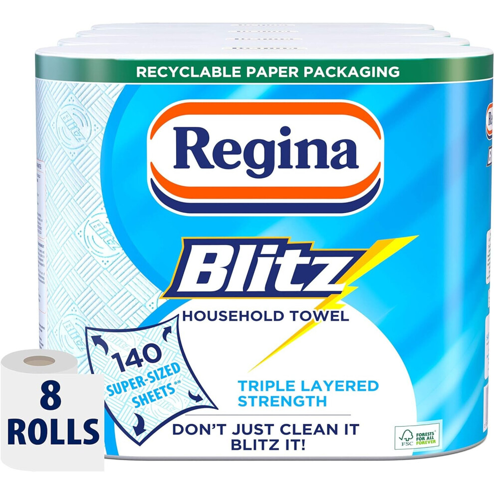 Regina Blitz Household Towels – 8 Triple Layered Rolls, 70 Sheets Per Roll, Paper Packaging, FSC Certified Paper, Recyclable Packaging, 60% Larger Than Standard Kitchen Roll Sheets