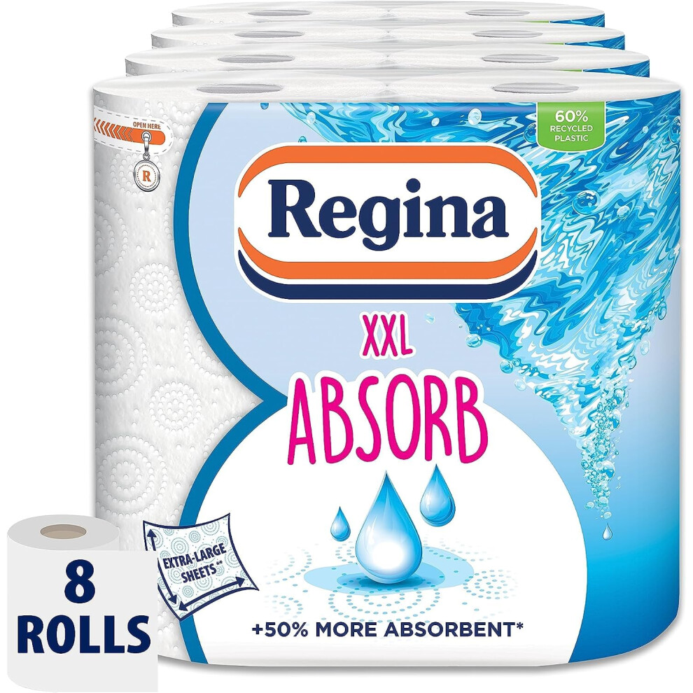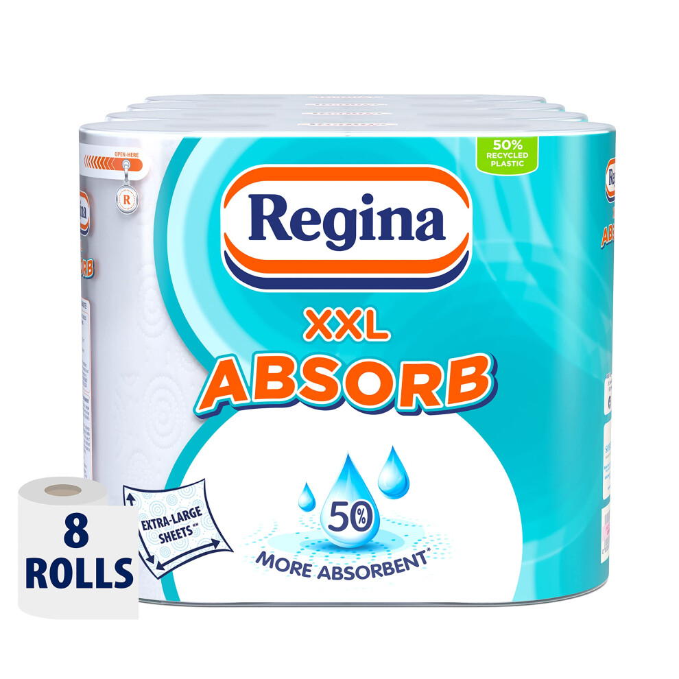 Regina Absorb Kitchen Towels – 8 Rolls Per Pack, Super Absorbent 2-ply Kitchen Towels, 75 Sheets Per Roll, Extra-large Sheets, 50percent More Than Previous XXL Products, Easy Open Pack