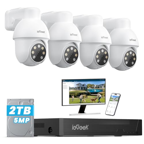 ieGeek【5MP+2TB HDD+360°PTZ】PoE Security CCTV Camera Systems with AI Human & Vehicle Detection, 4K Lite H.265+ DVR/NVR, 4PCS Home Security Cameras, Color Night Vision, Automatic Tracking, Remote Access