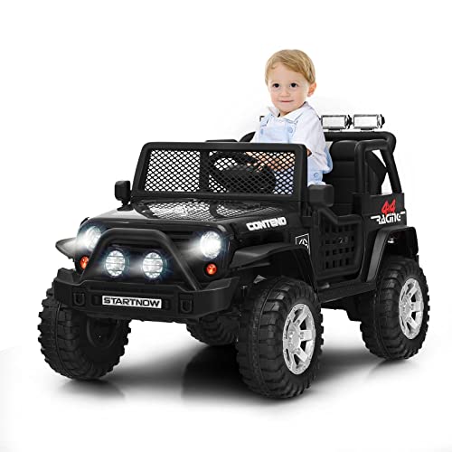 COSTWAY 12V Kids Electric Ride on Truck, Battery Powered Off-road Car with Remote Control, LED Lights, Horn, Music, 4 Spring Suspension Wheels Vehicle Toy for Children (Black)