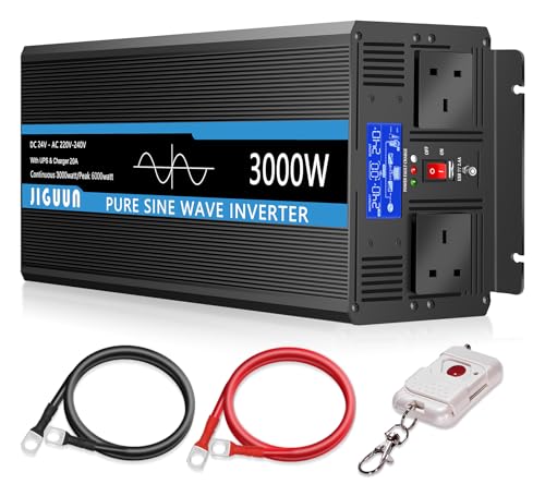 JIGUUN 3000W Inverter 24V 240V Pure Sine Wave with 20A Charger and Mains Priority and UPS Function, 2 UK Sockets, Wireless Remote Control and LCD Display Peak Power 6000W