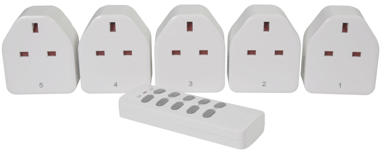 Mercury Set of 5 Remote Control Mains Sockets 30M Range Programmable Wireless