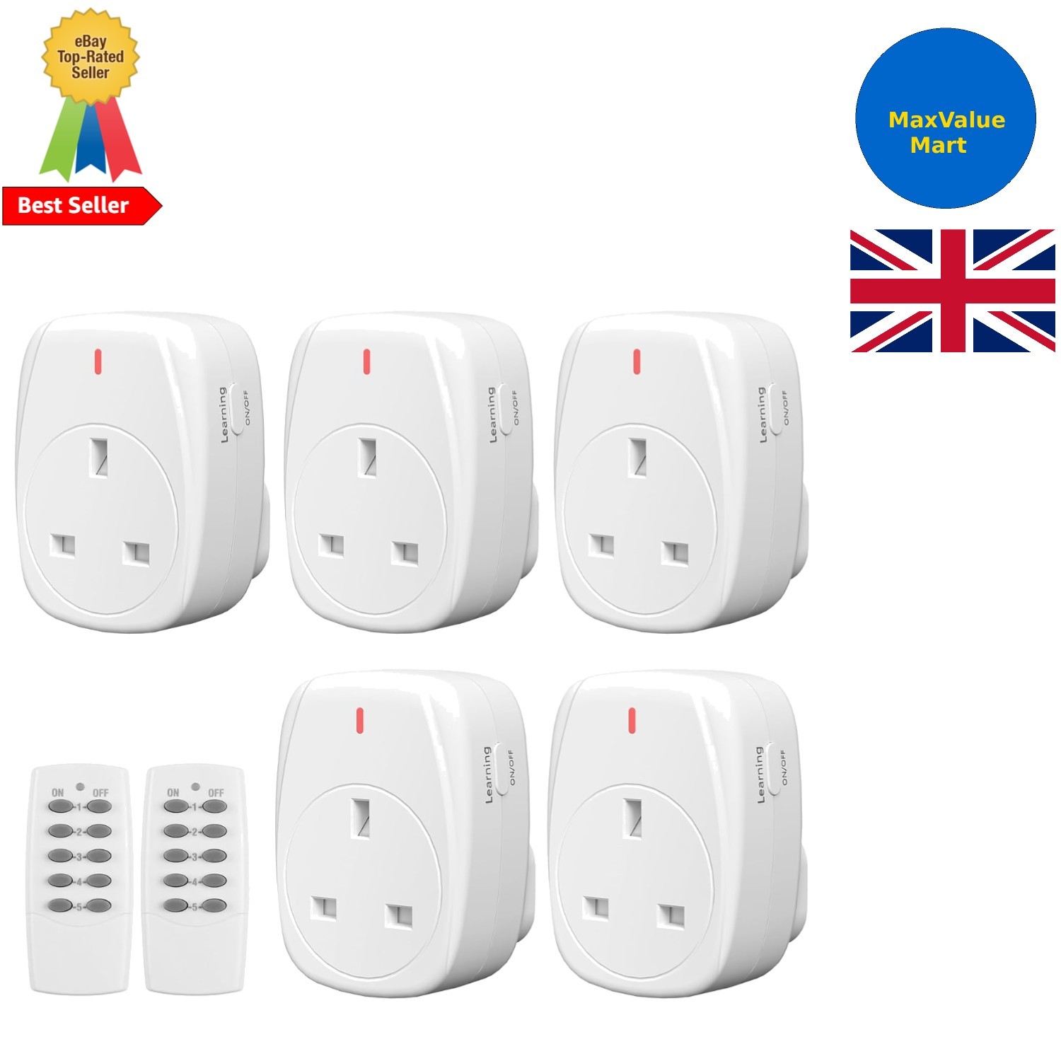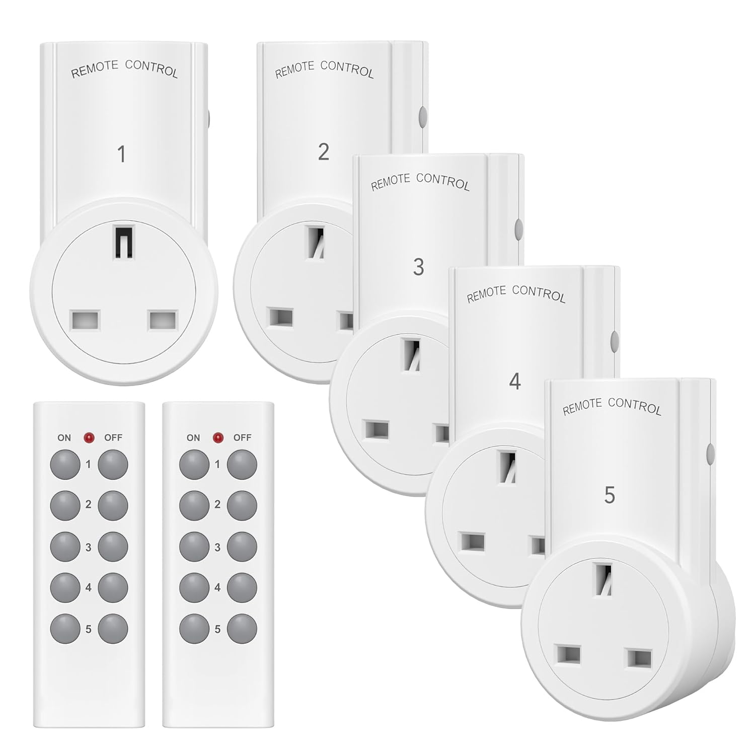 Heavy Duty 13A Remote Control Plug Sockets, 100ft Range, 5 Pack with 2 Remotes
