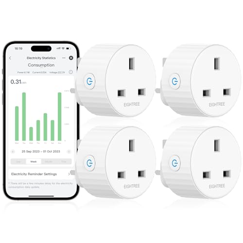 EIGHTREE Smart Plugs with Energy Monitoring, WiFi Smart Sockets with Remote Control and Timer, 2.4GHz Wi-Fi, 13A, 4 Pack - Alexa & Google Home Compatible