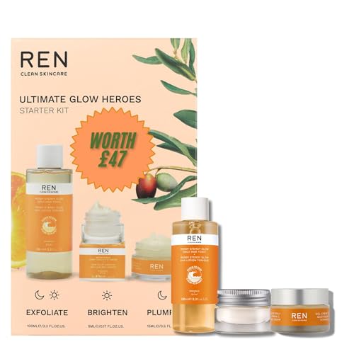 REN Radiance Ultimate Glow Heroes Starter Kit, Ready Steady Glow Daily AHA Tonic 100ml, Dark Circle Eye Cream 5ml, Glow Daily Vitamin C Gel Cream 15ml, Gift Set