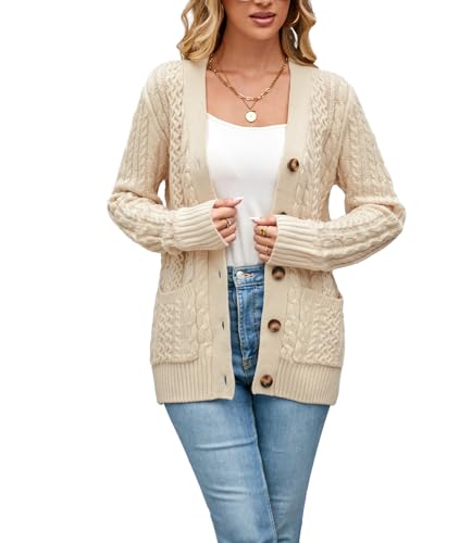 BuyiRen Womens Cardigan Sweaters Cable Knit Sweater 2026 Fall Winter Chunky Open Front Button Down Coats with Pockets, Beige, UK 14-16
