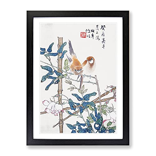 Two Birds Upon A Rose Bush By Ren Yi Asian Japanese Framed Wall Art Print, Ready to Hang Picture for Living Room Bedroom Home Office Décor, Black A3 (34 x 46 cm)