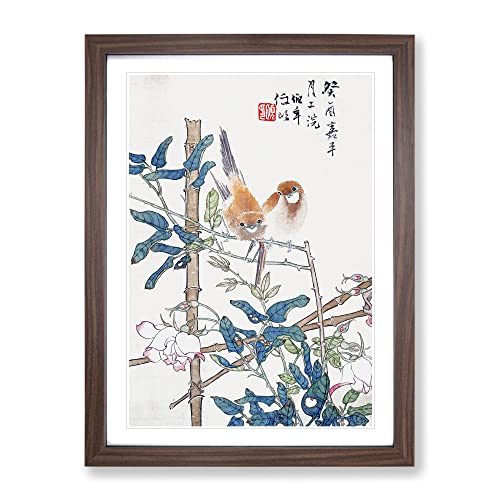 Two Birds Upon A Rose Bush By Ren Yi Asian Japanese Framed Wall Art Print, Ready to Hang Picture for Living Room Bedroom Home Office Décor, Walnut A4 (34 x 25 cm)