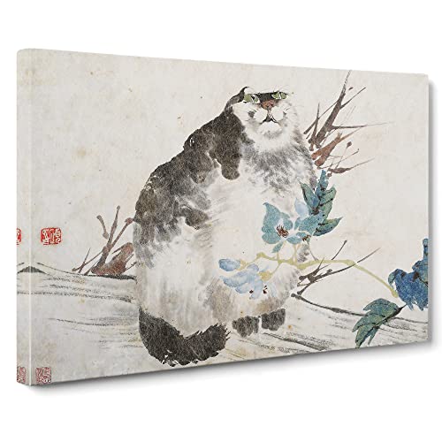 Fat Cat By Ren Yi Asian Japanese Canvas Wall Art Print Ready to Hang, Framed Picture for Living Room Bedroom Home Office Décor, 20x14 Inch (50x35 cm)