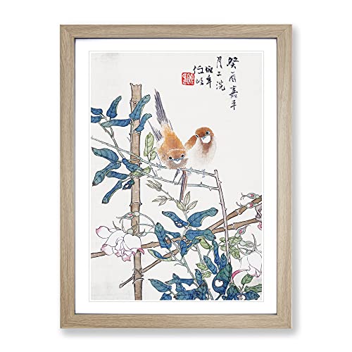 Two Birds Upon A Rose Bush By Ren Yi Asian Japanese Framed Wall Art Print, Ready to Hang Picture for Living Room Bedroom Home Office Décor, Oak A4 (34 x 25 cm)