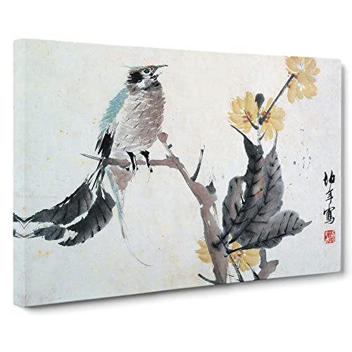 Bird Upon A Branch By Ren Yi Asian Japanese Canvas Wall Art Print Ready to Hang, Framed Picture for Living Room Bedroom Home Office Décor, 30x20 Inch (76x50 cm)