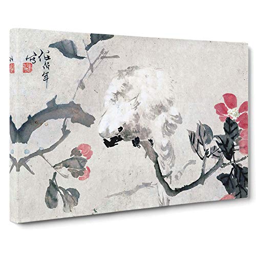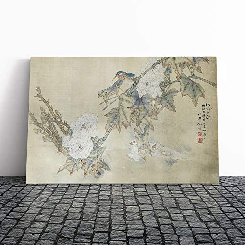 Bird Upon A Branch By Ren Yi Asian Japanese Canvas Wall Art Print Ready to Hang, Framed Picture for Living Room Bedroom Home Office Décor, 20x14 Inch (50x35 cm)