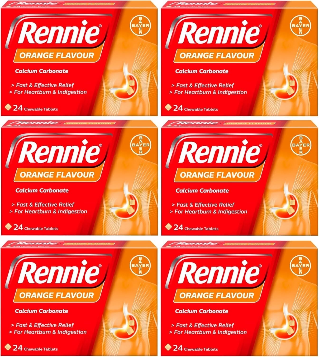 Rennie Orange - Antacids, Heartburn and Indigestion Fast and Effective Relief for Acid Reflux - 144 Tablets (6 Pack of 24 Tablets)