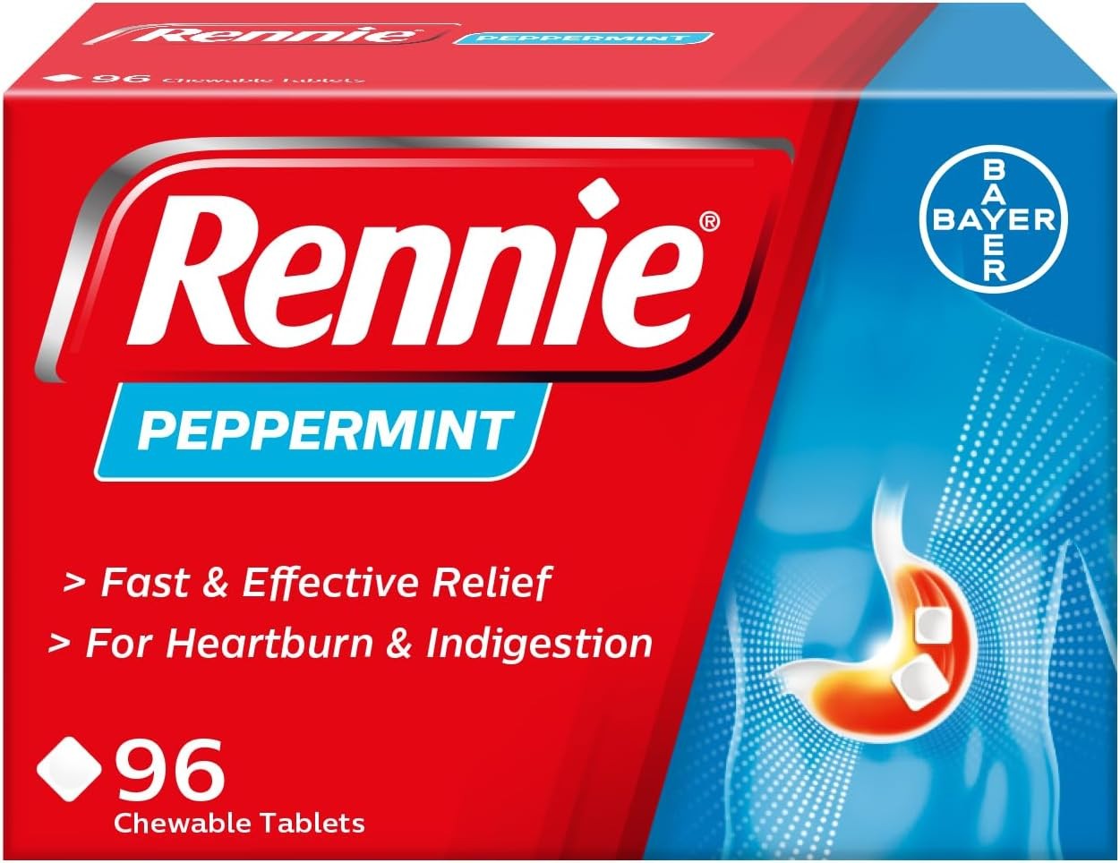 Rennie Peppermint Flavour Antacid, Heartburn and Indigestion Chewable Tablets, 1 Pack of 96 Tablets - Gets to Work in 60 Seconds f