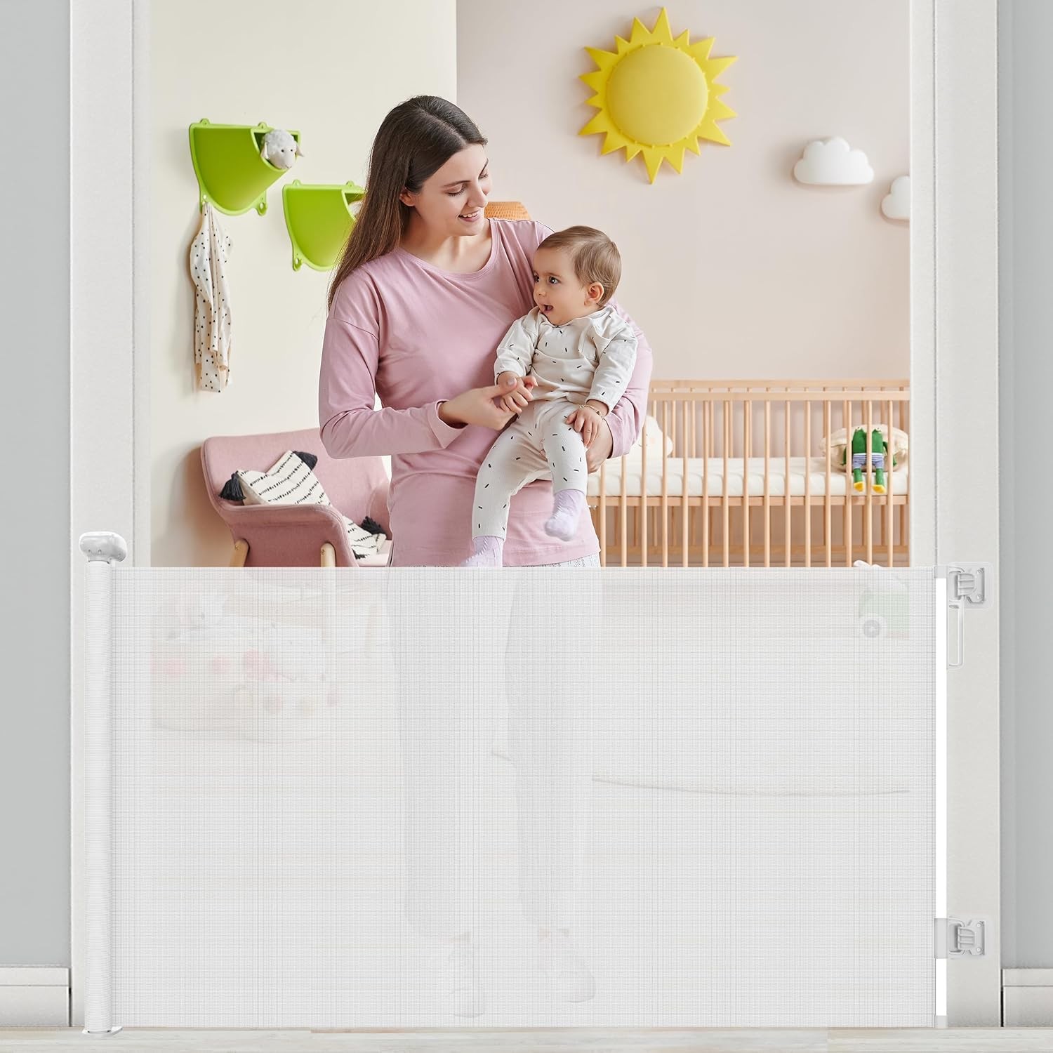 Retractable Baby Gate, 140cm Wide x 86cm Tall, Extra Tall Mesh Safety Gate for Baby & Pets, Indoor/Outdoor Use, Fits Doorways & Stairs, White