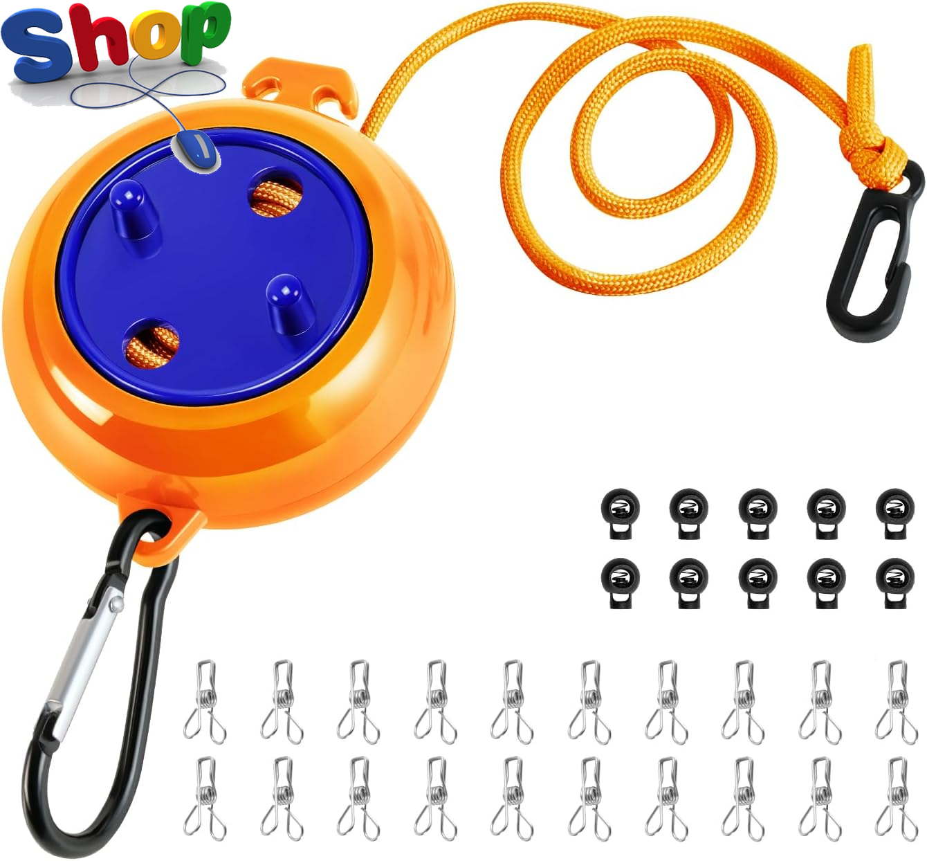 boxoon 32.8 Ft/10 M Portable Travel Clothesline Kit, Retractable Orange Camping Clothes Line, Hand-Crank Laundry Drying Rope With 20 Clips And 10 Buckles, 3-Piece Set